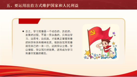 支部要求全体党员以习近平新时代中国特色社会主义思想为指引,认真学习新党章的内涵,领会其精神,以新党章中对党员的要求作为行动的准则。牢固树立自觉遵守党章的意识,坚决维护党章。要融会贯通深入推进党章学习,既要做到从党章文本出发,原原本本学、反反复复学,做到知其然。又要联系实际学、深入思考学,做到知其所以然。只有边学习、边思考、边实践,才能真正掌握党章的科学体系和精神实质,做到自觉用党章规范自己的一言一行,达到学以立德、学以增智、学以笃行的效果,进而成为学习和遵守党章的模范。