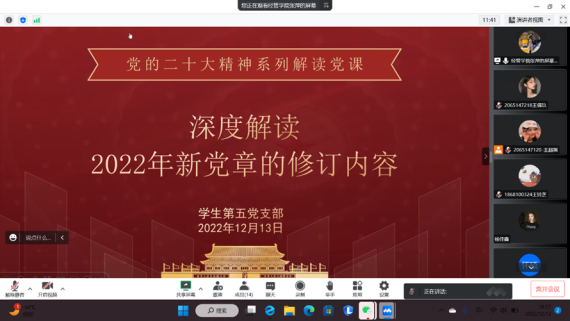 高瞻远瞩绘蓝图,踔厉奋发谱新篇。为深入学习宣传贯彻党的二十大精神,引导支部党员牢固树立党章意识,全面理解党章内容,时刻遵守并践行党章,2022年12月13日晚,米兰milan官方网站学生第五党支部组织开展党的二十大精神系列党课之学习《中国共产党章程(修正案)》。由党支部书记主讲,全体党员参加。