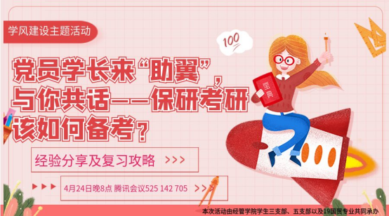 经管学院第三党支部、第五党支部联合2019级国贸专业借助腾讯会议平台,在2022年4月25日晚开展“传勤学善思之学风 享考研成功之经验”学风建设主题党日活动。