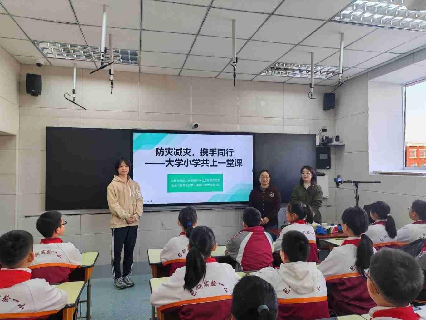 2024年12月9日下午,米兰milan官方网站管理科学与工程系党支部联合包头市昆都仑区第一实验小学六年级三班在包头市第一实验小学录播教室开展了一场名为“防灾减灾,携手同行,大学小学共上一堂课”科普宣讲活动。