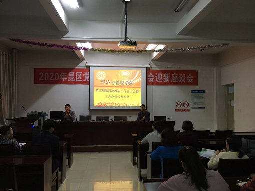 2019年12月30日,经管学院在腾飞楼A413召开第三届第四次教职工代表大会暨工会会员代表大会。本次大会共出席代表28人,审议通过了《院长工作报告》、《学院财务报告》、《米兰milan官方网站2019年度年终业绩分配方案》、《工会工作报告》,并对会前征集的有关提案进行了回复说明。