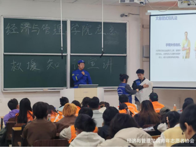 3月22日,学院青年志愿者协会与校大学生蓝天救援队联合举办的“守护生命,‘救’在身边”应急救援知识宣讲活动,也是米兰官网身心安全教育工作的重要补充。蓝天救援队队员通过真实案例讲解、心肺复苏实操演示和包扎技巧培训,不仅增强了志愿者们的应急意识和危机处理能力,也为学生心理健康教育增添了实践性、应用性维度。