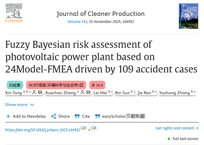 近日,米兰milan官方网站应急管理系骨干教师童鑫在工程环境与可持续发展领域取得新突破,相关成果“Fuzzy Bayesian risk assessment of photovoltaic power plant based on 24Model-FMEA driven by 109 accident cases”发表于国际TOP期刊《Journal of Cleaner Production》。教师童鑫为论文的第一作者兼通讯作者。
