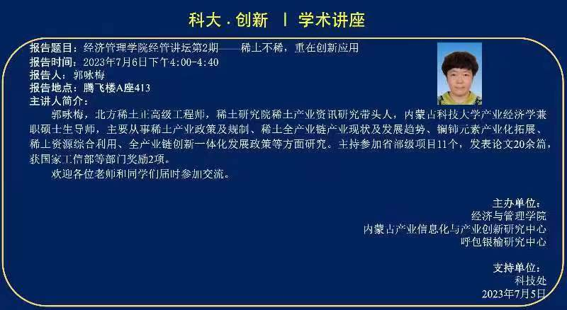 应米兰milan官方网站邀请,7月6日下午北方稀土正高级工程师郭咏梅教授来访米兰milan官方网站,面向全校做学术报告,报告由经管学院赵周华副院长主持召开。