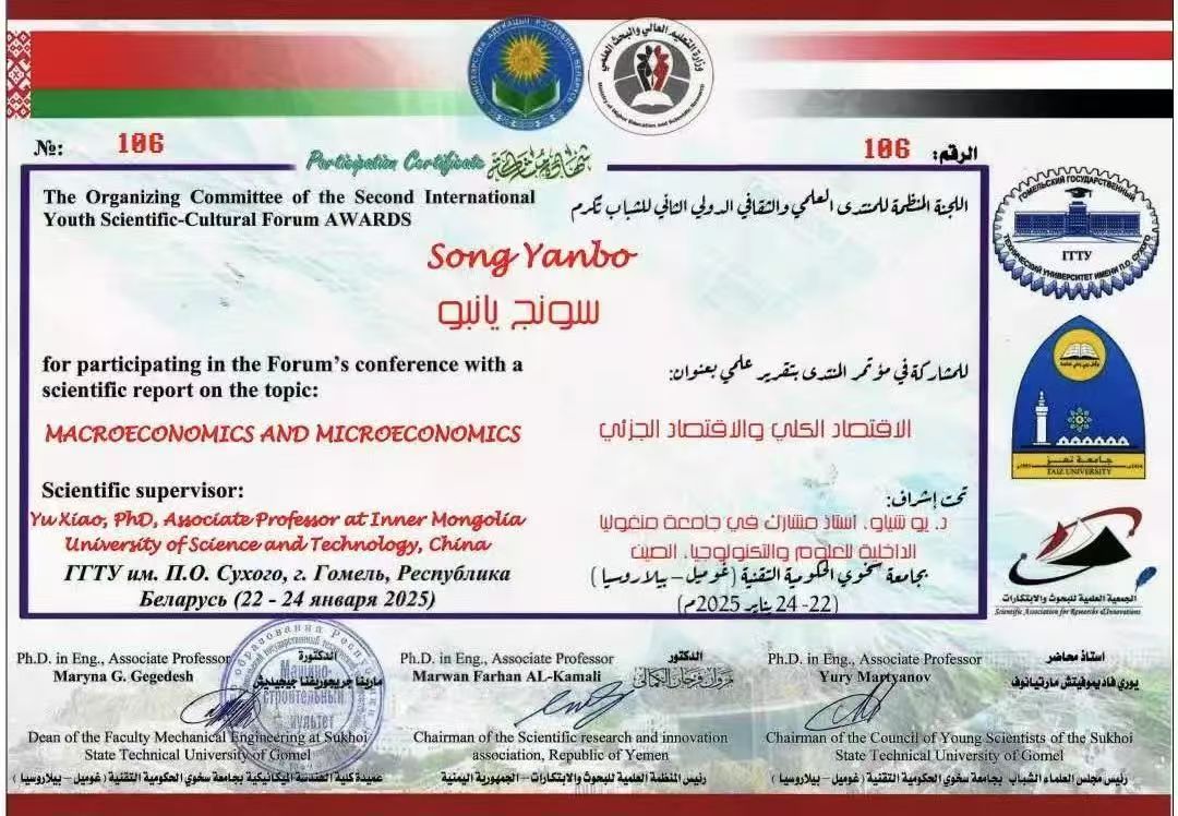 近日,第二届青年科学文化论坛在白俄罗斯戈梅利国立技术大学举行。米兰官网2024级国际经济与贸易专业学生宋彦博参加活动,其撰写报告“MACROECONOMICS AND MICROECONOMICS”获第二届国际青年科学文化论坛组织委员会颁发的优秀论文证书。