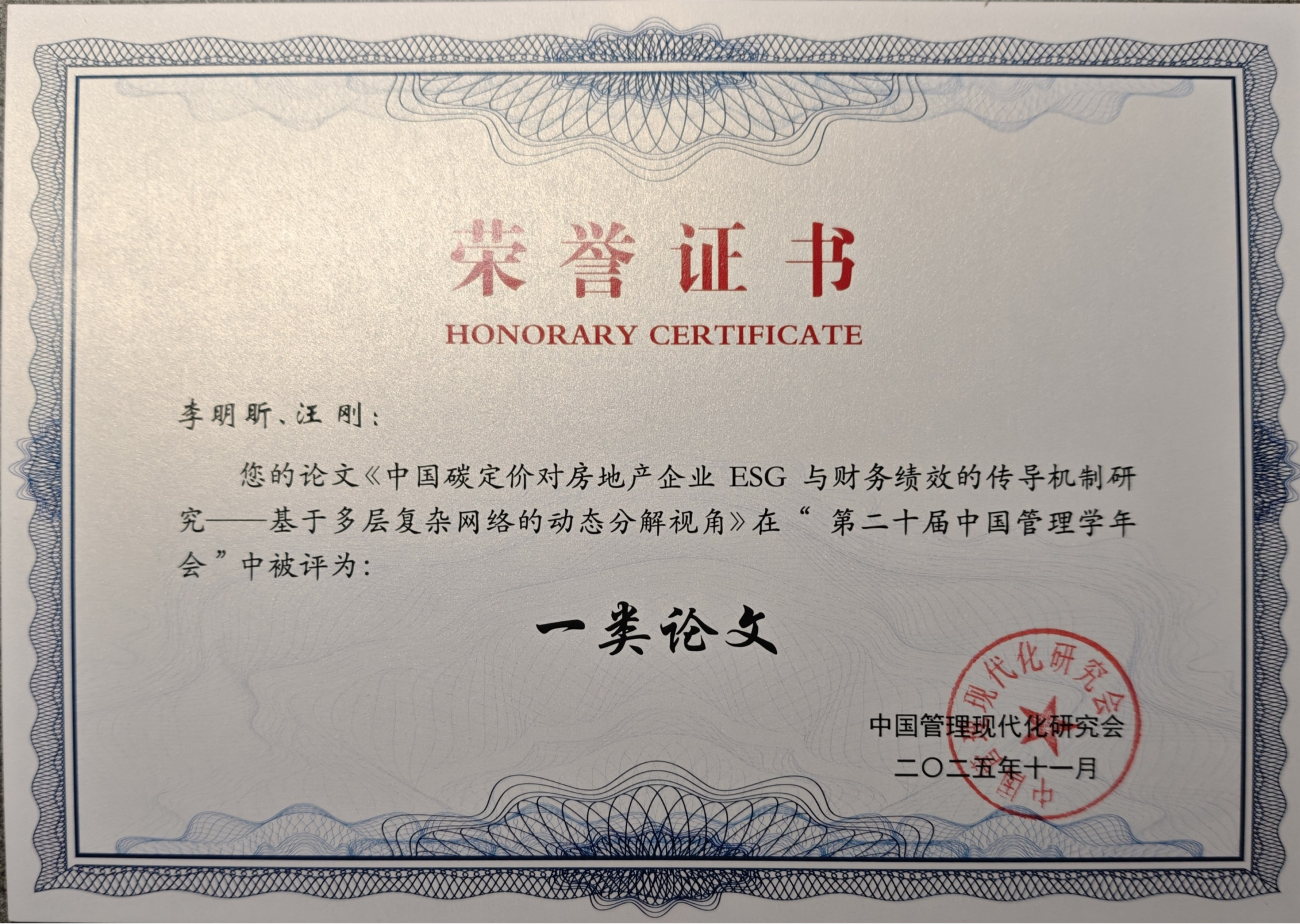 本届年会共计收到投稿论文1700篇,在各专题学术委员会和大会学术委员会推荐论文的基础上,经年会优秀论文终审工作组专家评审,最终评选出47篇优秀论文。李明昕教授和2024会计专硕研究生汪刚合作的论文《中国碳定价对房地产企业ESG与财务绩效的传导机制研究——基于多层复杂网络的动态分解视角》获会议优秀论文一等奖(一类论文)。