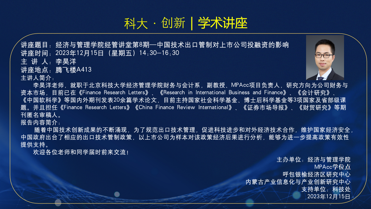 讲座题目:米兰milan官方网站经管讲堂第8期—中国技术出口管制对上市公司投融资的影响